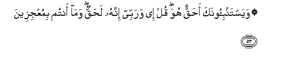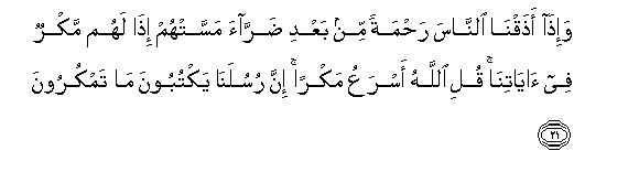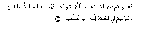 10. Wito wao humo utakuwa: Subhanaka Llahumma "Umetakasika Ee Mwenyezi Mungu!" Na maamkio yao humo ni "Salama". Na mwisho wa wito wao ni: Alhamdulillahi Rabbil A'lamiin "Kuhimidiwa kote ni kwa Mwenyezi Mungu, Mola Mlezi wa walimwengu wote."