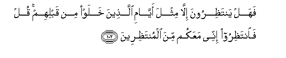 102. Basi, je! Wanangojea jingine ila kama yaliyo tokea siku za watu walio pita kabla yao? Ngojeni! Nami ni pamoja nanyi katika wanao ngoja.102