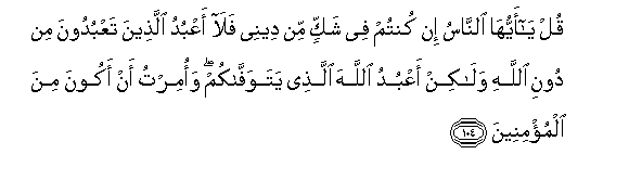mimi namuabudu Mwenyezi Mungu anaye kufisheni. Na nimeamrishwa niwe miongoni mwa Waumini.104