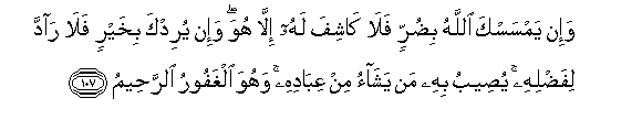 107. Na Mwenyezi Mungu akikugusisha madhara, basi hapana wa kukuondolea ila Yeye. Na akikutakia kheri, basi hapana awezaye kurudisha fadhila yake.Huifikisha kwa amtakaye katika waja wake, na Yeye ni Mwenye kusamehe, Mwenye kurehemu.107