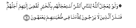 shari kama wanavyo jihimizia kuletewa kheri, bila ya shaka wangelisha timiziwa ajali yao. Lakini tunawaacha wale wasio tumainia kukutana nasi wakihangaika katika upotovu wao.