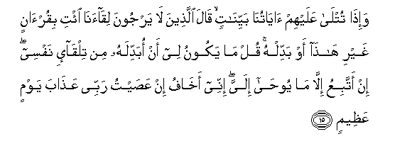 15. Na wanapo somewa Aya zetu zilizo wazi, wale wasio taraji kukutana na Sisi husema: Lete Qur'ani isiyo kuwa hii, au ibadilishe. Sema: Hainifalii mimi kuibadilisha kwa nitakavyo nafsi yangu. Mimi sifuati ila ninayo funuliwa kwa Wahyi. Hakika mimi naogopa, nikimuasi Mola wangu Mlezi, adhabu ya Siku iliyo kuu.15