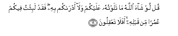 16. Sema: Mwenyezi Mungu angeli taka nisingeli kusomeeni, wala nisingeli kujuvyeni. Kwani nalikwisha kaa nanyi umri mzima kabla yake! Basi, je! Hamzingatii?