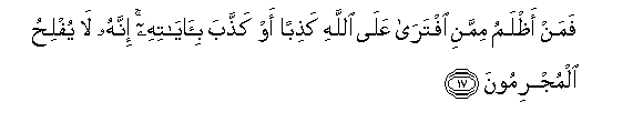 17. Basi ni nani aliye dhaalimu zaidi kuliko yule anaye mzulia uwongo Mwenyezi Mungu na akazikanusha Ishara zake? Hakika hawafanikiwi wakosefu.