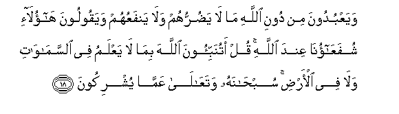18. Nao, badala ya Mwenyezi Mungu, wanaabudu wasio wadhuru wala kuwanufaisha,na wanasema: Hawa ndio waombezi wetu kwa Mwenyezi Mungu! Sema: Je! Mnamwambia Mwenyezi Mungu asiyo yajua ya katika mbingu wala katika ardhi? Subhanahu wa Taa'la! Ametakasika na ametukuka na hao wanao mshirikisha naye.