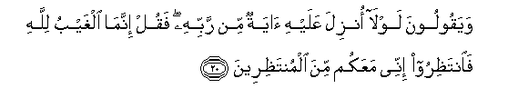 20. Na wanasema: Kwa nini hakuteremshiwa Ishara kutoka kwa Mola wake Mlezi? Sema: Mambo ya ghaibu ni ya Mwenyezi Mungu. Basi nyinyi ngojeni, na mimi ni pamoja nanyi katika wanao ngojea.