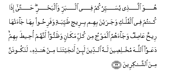 mkali ukawazukia, na yakawajia mawimbi kutoka kila upande, na wakaona wameshazongwa, basi hapo humwomba Mwenyezi Mungu kwa kumsafishia niya: Ukituokoa na haya bila ya shaka tutakuwa miongoni mwa wanao shukuru.