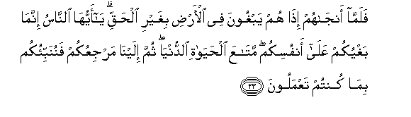 23. Lakini akisha waokoa, mara wanafanya jeuri tena katika nchi bila ya haki. Enyi watu! Jeuri zenu zitakudhuruni wenyewe. Hii ni starehe ya maisha ya dunia tu. Kisha marejeo yenu ni kwetu, na hapo tutakuambieni