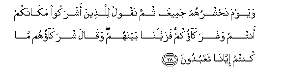 28. Na siku tutakapo wakusanya wote, kisha tutawaambia walio shirikisha:Simameni mahali penu nyinyi na wale mlio wafanya washirika. Kisha tutawatenga baina yao. Na hao walio washirikisha watasema: Nyinyi hamkuwa mkituabudu sisi.
