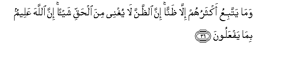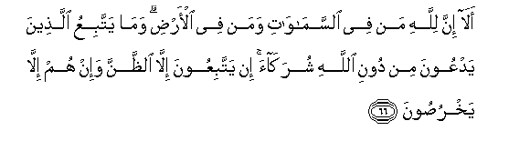 66. Jueni kuwa ni vya Mwenyezi Mungu vyote viliomo mbinguni na ardhinii.Na wala hawawafuati hao wanao waomba badala ya Mwenyezi Mungu kuwa ni washirika wake. Wao hawafuati ila dhana tu, na hawasemi ila uwongo.66