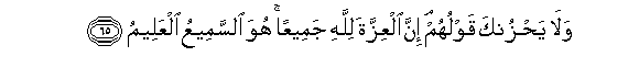 65. Wala yasikuhuzunishe maneno yao. Hakika utukufu wote ni wa Mwenyezi Mungu. Yeye ndiye Mwenye kusikia Mwenye kujua.65