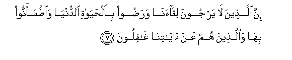 7. Hakika wasio taraji kukutana nasi, na wakaridhia maisha ya dunia