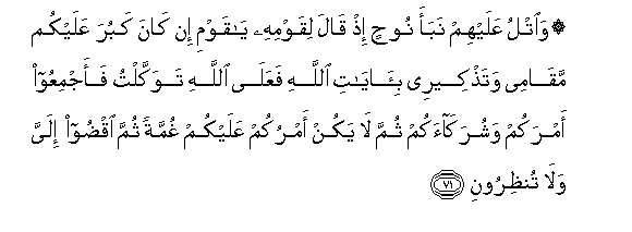 71. Wasomee khabari za Nuhu alipo waambia watu wake: Enyi watu wangu!Ikiwa kukaa kwangu nanyi na kukumbusha kwangu kwa Ishara za Mwenyezi Mungu kunakutieni mashaka basi mimi namtegemea Mwenyezi Mungu. Nanyi tengezeni mambo yenu pamoja na washirika wenu, na wala mambo yenu yasifichikane kwenu.Kisha nihukumuni, wala msinipe muhula.71