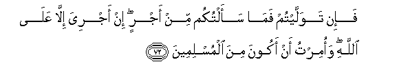 72. Lakini mkigeuka, basi mimi sikukuombeni ujira. Ujira wangu hauko ila kwa Mwenyezi Mungu. Na nimeamrishwa niwe miongoni mwa Waislamu.72