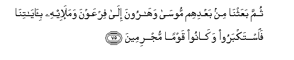 75. Kisha baada yao tukamtuma Musa na Haruni kwa Firauni na waheshimiwa wake, kwa Ishara zetu. Wakajivuna, na wakawa watu wakosefu.a href="c10.html#75">75