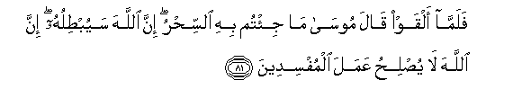 81. Walipo tupa, Musa alisema: Mliyo leta ni uchawi. Hakika Mwenyezi Mungu haitengenezi kazi ya waharibifu.81