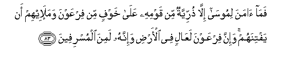 83. Basi hawakumuamini Musa isipo kuwa baadhi ya vijana vya kaumu
