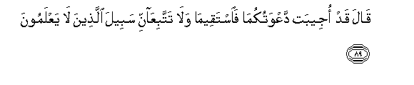 89. Mwenyezi Mungu akasema: Maombi yenu yamekubaliwa. Basi simameni