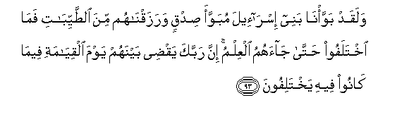 93. Na hakika tuliwaweka Wana wa Is raili kikao chema, na tukawaruzuku vitu vizuri. Nao hawakukhitalifiana mpaka ilipo wafikia ilimu. Hakika Mola wako Mlezi atahukumu baina yao Siku ya Kiyama katika yale waliyo kuwa wakikhitalifiana.93
