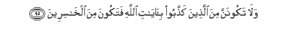 95. Na kabisa usiwe miongoni mwa wale wanao zikanusha Ishara za Mwenyezi Mungu, usije kuwa katika walio khasiri.95