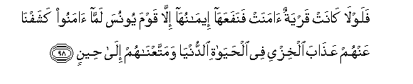 isipo kuwa kaumu Yunus? Waliamini na Sisi tukawaondolea adhabu ya hizaya