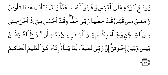 100. Na akawapandisha wazazi wake kwenye kiti cha enzi. Na wote wakaporomoka