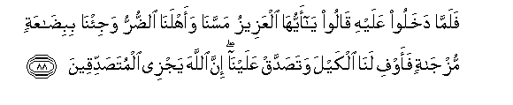 88. Basi walipo ingia kwa Yusuf walisema: Ewe Mheshimiwa! Imetupata
