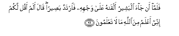 96. Basi alipo fika mbashiri na akaiweka kanzu usoni pake alirejea