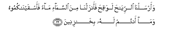 22. Na tunazipeleka pepo za kupandishia, na tunateremsha kutoka mbinguni maji, kisha tukakunywesheni maji hayo. Wala si nyinyi mnayo yaweka.