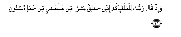 28. Na Mola wako Mlezi alipo waambia Malaika: Hakika Mimi nitamuumba mtu kwa udongo unao toa sauti, unao tokana na matope yaliyo tiwa sura.