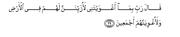 39. Akasema: Mola wangu Mlezi! Ilivyo kuwa umenitia makosani, basi nahakikisha nitawazaini hapa duniani na nitawapoteza wote,