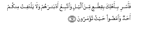 65. Basi ondoka na ahli zako usiku ungalipo, nawe ufuate nyuma yao,wala yeyote kati yenu asigeuke nyuma. Na mwende mnapo amrishwa.