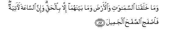 85. Na hatukuziumba mbingu na ardhi na vilivyomo ndani yake ila kwa ajili ya Haki. Na hakika Kiyama kitafika. Basi samehe msamaha mzuri.