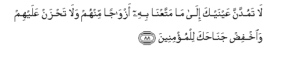 88. Usivitumbulie macho yako vitu tulivyo waneemesha makundi fulani kati yao, wala usiwahuzunikie. Na wainamishie bawa lako (la huruma) Waumini.