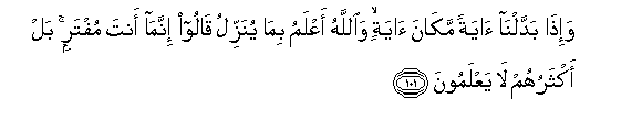 101. Na tunapo badilisha Ishara pahala pa Ishara nyengine, na MwenyeziMungu anajua anayo teremsha, wao husema: Wewe ni mzushi. Bali wengi wao hawajui kitu.