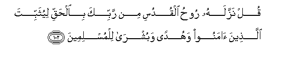 102. Sema: Ameiteremsha hii Roho takatifu kutokana na Mola wako Mlezi kwa haki, ili awathibitishe wale walio amini, na kuwa ni uwongofu, na ni bishara kwa Waislamu.