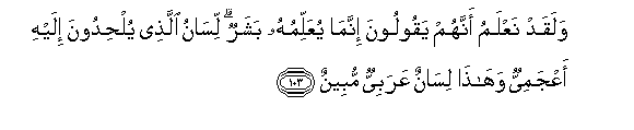 103. Na Sisi hakika tunajua kwamba wanasema: Yuko mtu anaye mfundisha.Lugha ya huyo wanaye muelekezea ni ya kigeni, na hii ni lugha ya Kiarabu mbayana.