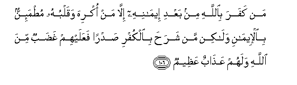 106. Anaye mkataa Mwenyezi Mungu baada ya kuamini kwake - isipo kuwa aliye lazimishwa na hali ya kuwa moyo wake umetua juu ya Imani, lakini aliye kifungulia kifua chake kukataa - basi hao ghadhabu ya Mwenyezi Mungu ipo juu yao, na wao watapata adhabu kubwa.