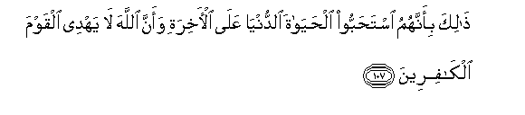 107. Hayo ni kwa sababu wameyapenda zaidi maisha ya duniani kuliko ya Akhera, na kwa sababu Mwenyezi Mungu hawaongoi watu makafiri.