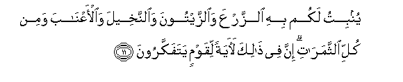 11. Kwa hayo Yeye anaizalisha kwa ajili yenu mimea, na mizaituni,na mitende, na mizabibu, na kila namna ya matunda. Hakika katika haya zipo ishara kwa watu wanao fikiri.