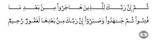 110. Kisha hakika Mola wako Mlezi, kwa wale walio hama makwao baada ya kuteswa, kisha wakapigania Dini na wakasubiri, bila ya shaka Mola wako Mlezi baada ya hayo ni Mwenye kusamehe Mwenye kurehemu.