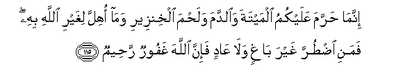 115. Amekuharimishieni nyamafu tu, na damu, na nyama ya nguruwe,na mnyama aliye chinjwa kwa ajili isiyo kuwa ya Mwenyezi Mungu. Lakini anaye lazimishwa bila ya kuasi, wala kuruka mipaka, basi hakika MwenyeziMungu ni Mwenye kusamehe na Mwenye kurehemu.