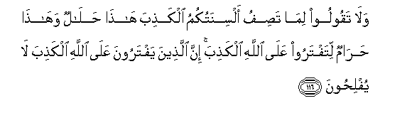 116. Wala msiseme uwongo, kwa kuropokwa na ndimi zenu: Hichi halali,na hichi haramu - mkimzulia uwongo Mwenyezi Mungu. Hakika wanao mzulia uwongo Mwenyezi Mungu hawatafanikiwa.
