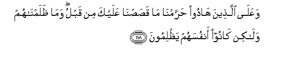 118. Na Mayahudi tuliwaharimishia yale tuliyo kuhadithia zamani.Na Sisi hatukuwadhulumu, bali walikuwa wakijudhulumu wenyewe.