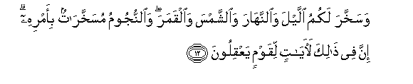 12. Na amefanya ukutumikieni usiku na mchana, na jua na mwezi,na nyota zikutumikieni kwa amri yake. Hakika katika hayo zipo ishara kwa watu wenye akili.