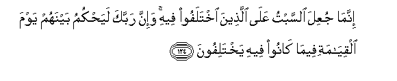 124. Hakika siku ya Sabato (Jumaamosi) waliwekewa wale walio khitalifiana kwa ajili yake. Na hakika Mola wako Mlezi bila ya shaka atahukumu baina yao Siku ya Kiyama katika yale waliyo kuwa wakikhitalifiana.