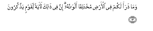 13. Na hivi alivyo vieneza katika ardhi vya rangi mbali mbali. Hakika katika hayo ipo ishara kwa watu wanao waidhika.