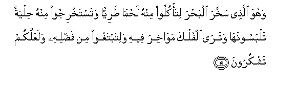 14. Yeye ndiye aliye ifanya bahari ikutumikieni, ili kutokana na humo mpate kula nyama laini, na mtoe humo mapambo mnayo yavaa. Na unaona marikebu zikikata maji humo, ili mtafute fadhila yake, na mpate kushukuru.