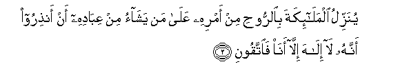 2. Huwateremsha Malaika na Roho kwa amri yake juu ya amtakaye katika waja wake ili nyinyi muonye kwamba hapana mungu ila Mimi, basi nicheni Mimi.