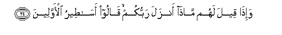 24. Na wanapo ambiwa: Kateremsha nini Mola wenu Mlezi? Husema: Hadithi za kubuni za watu wa kale!